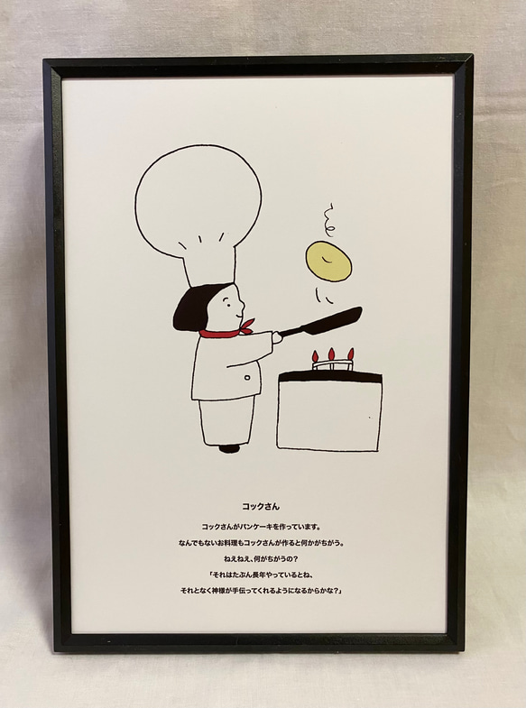 シャンティーの絵とおはなし」シリーズより「コックさん」コックさんがパンケーキを作っています。なんでもないお料理もコックさんが作ると何かがちがう。ねえねえ、何がちがうの?「それはたぶん長年やっているとね、それとなく神様が手伝ってくれるようにな