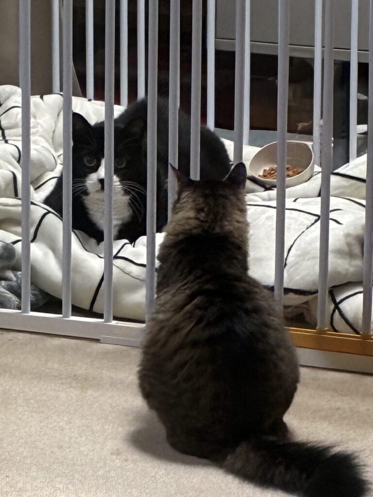 と、心配しつつもドア越しに見てるとお互い鼻チューしてその後落ち着いて向かい合わせて座りました。