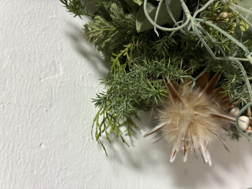 この前ワークショップで作ったリースを玄関横に移動しました。