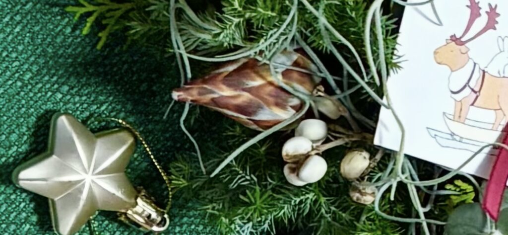 それで、昨日気がついたんだけど、リースに使ったなんとかいうつぼみが、飾っていると開いてくるよと先生に教えていただいたのを忘れてて、よく見るとほんときれいに開いてました!