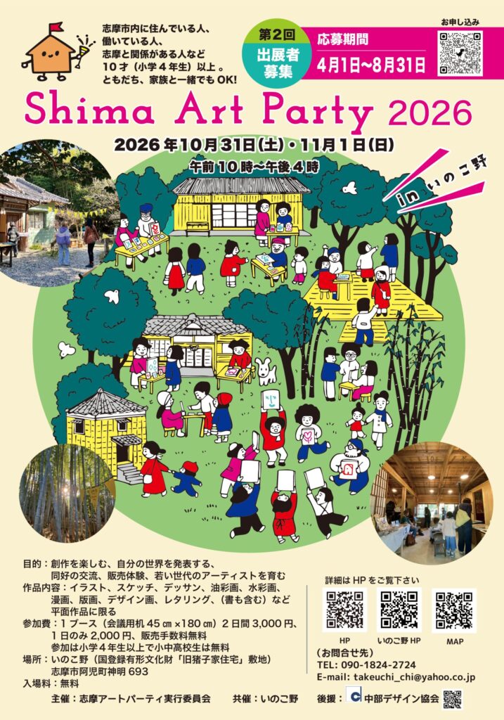 未分類 第2回志摩アートパーティ参加者募集^_^ 今日はまたあたたかくて、朝からギャラリーの草引きが少しできました。ぼちぼち実家の庭の草木も手入れが必要な季節になってきて、その点は気が重い〜。でも、春はあちこちで桜や花々も咲き誇って気分は明るい^_^さて、今年も気がつけばそんなこんなでもう 2026.03.16 未分類